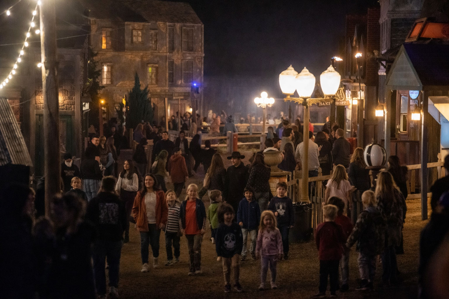 A glowing pumpkin neighborhood filled with themed cabins, cozy vignettes, carved sculptures, and interactive displays.